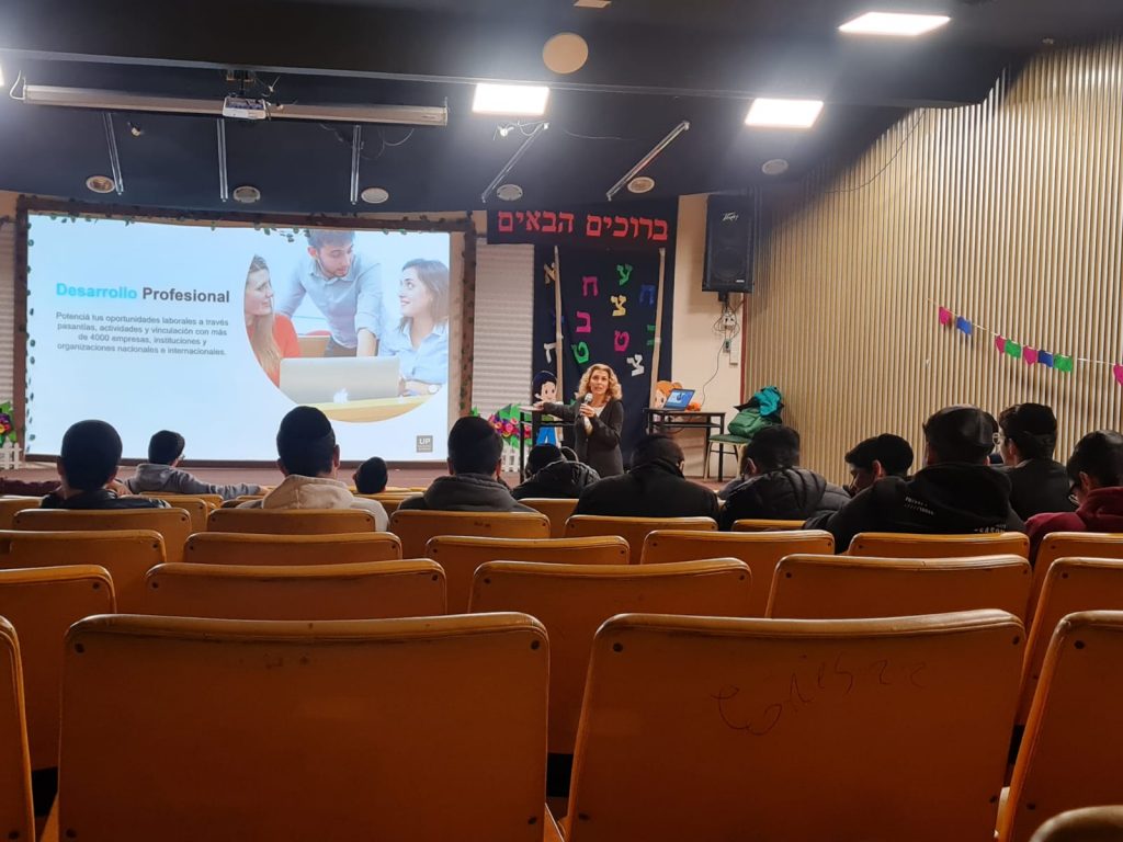 El día miércoles 6/9 se realizó una charla en el micro cine para todos los alumnos y alumnas de 5to año dada por Carmen Macedonio, Coordinadora de Relaciones con colegios secundario de la Universidad de Palermo. En la misma, se presentó y desarrolló el programa Menorá de la Universidad de Palermo en la cual se brindó información acerca de las facultades y carreras que ofrece, para que luego el alumnado pueda tener las herramientas necesarias para evaluar y escoger un futuro estudio, adecuado a su vocación.